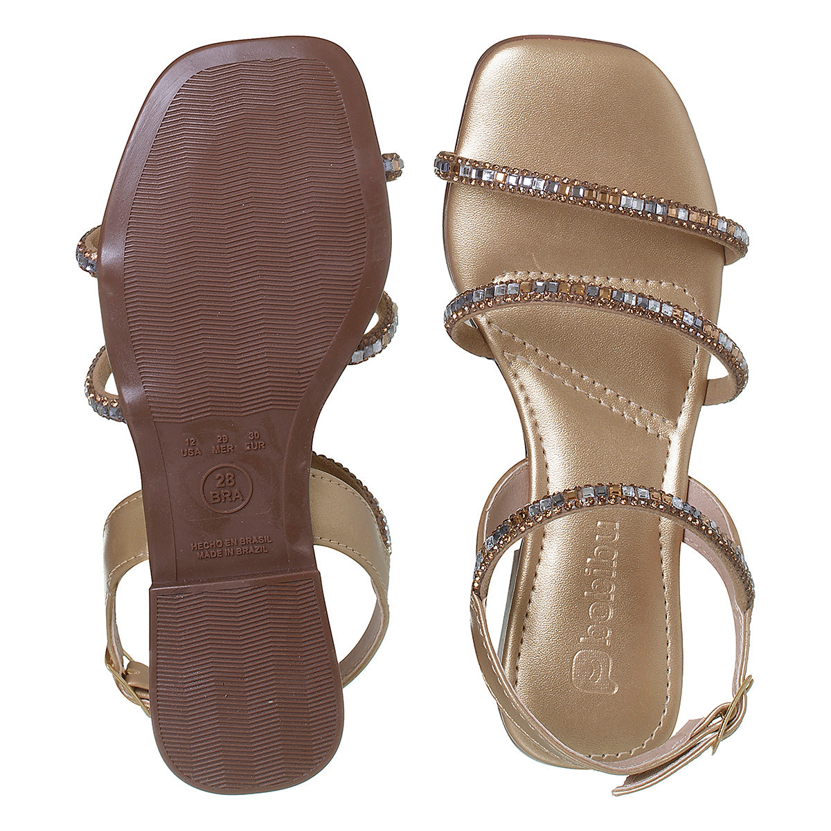 A Sandália Infantil Feminina Dourada com Strass é puro encanto! ✨ Com design moderno e delicado, o modelo possui tiras finas decoradas com pedrarias brilhantes, garantindo um toque de glamour em cada passo.