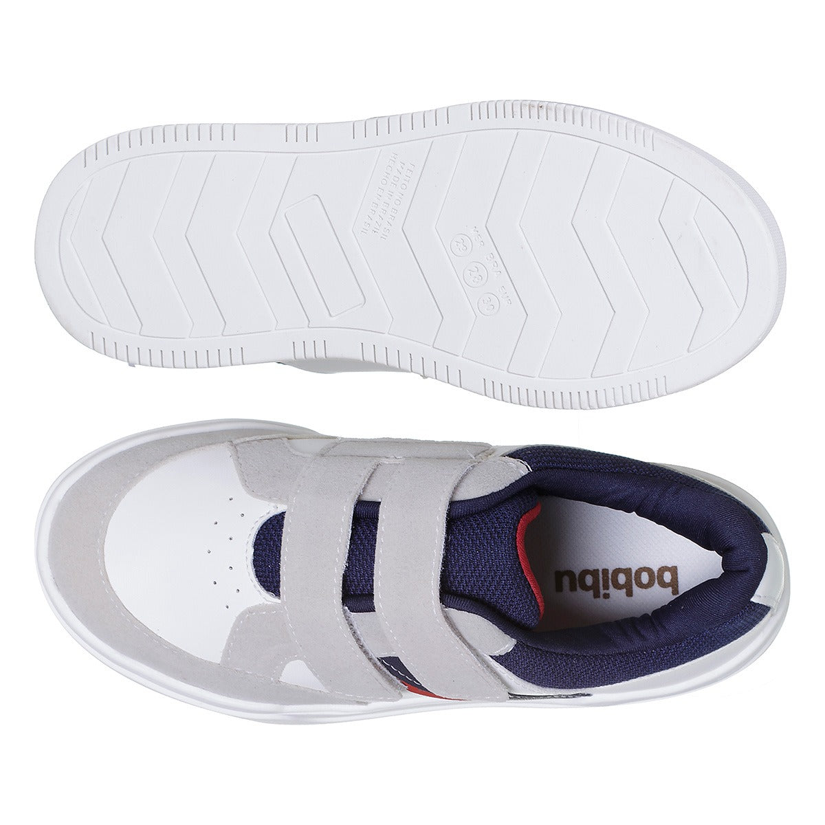 O cabedal combina as cores branco, azul-marinho e detalhe vermelho, resultando em um visual atual e versátil, fácil de combinar com diversos looks. As tiras aderentes duplas proporcionam praticidade no calce e um ajuste seguro.