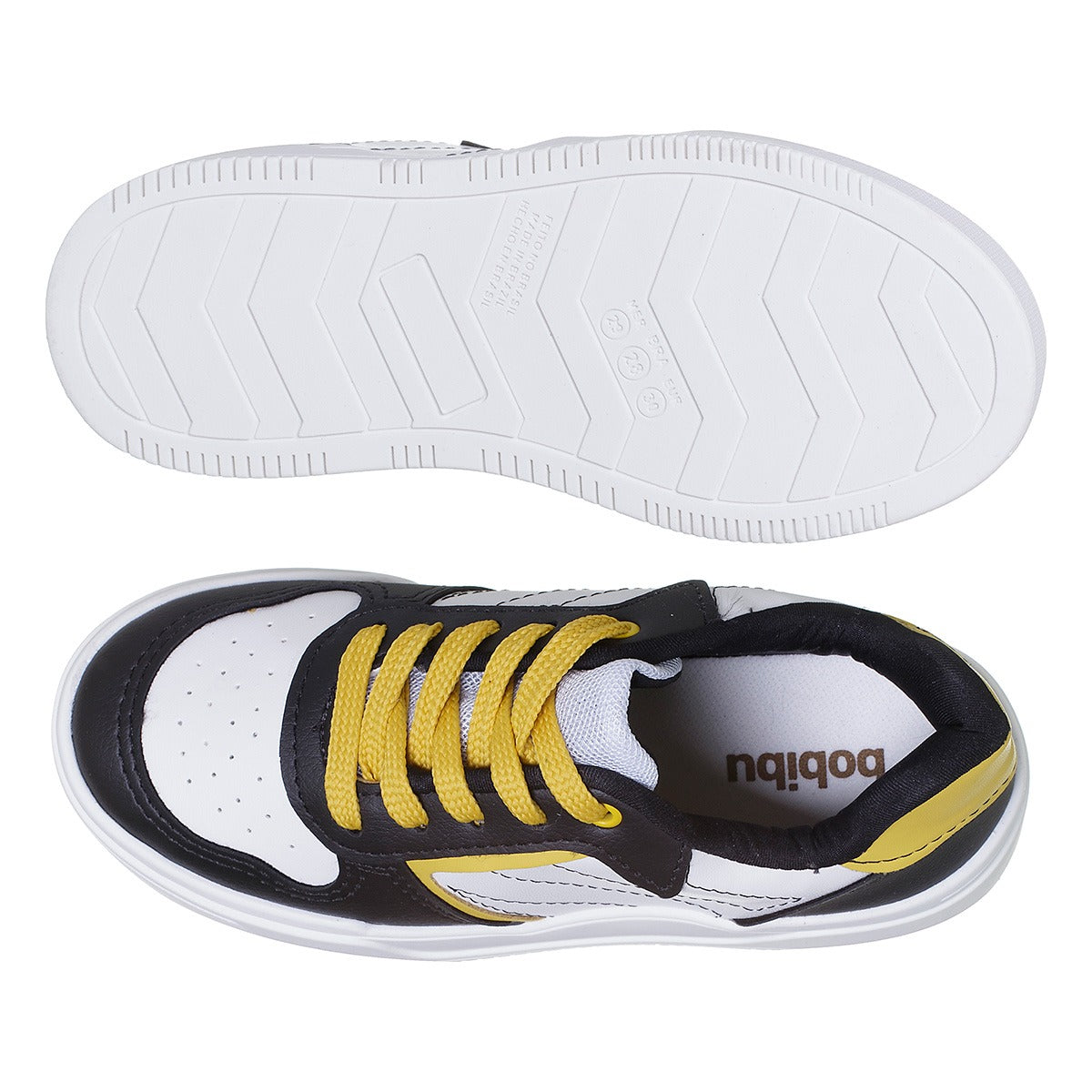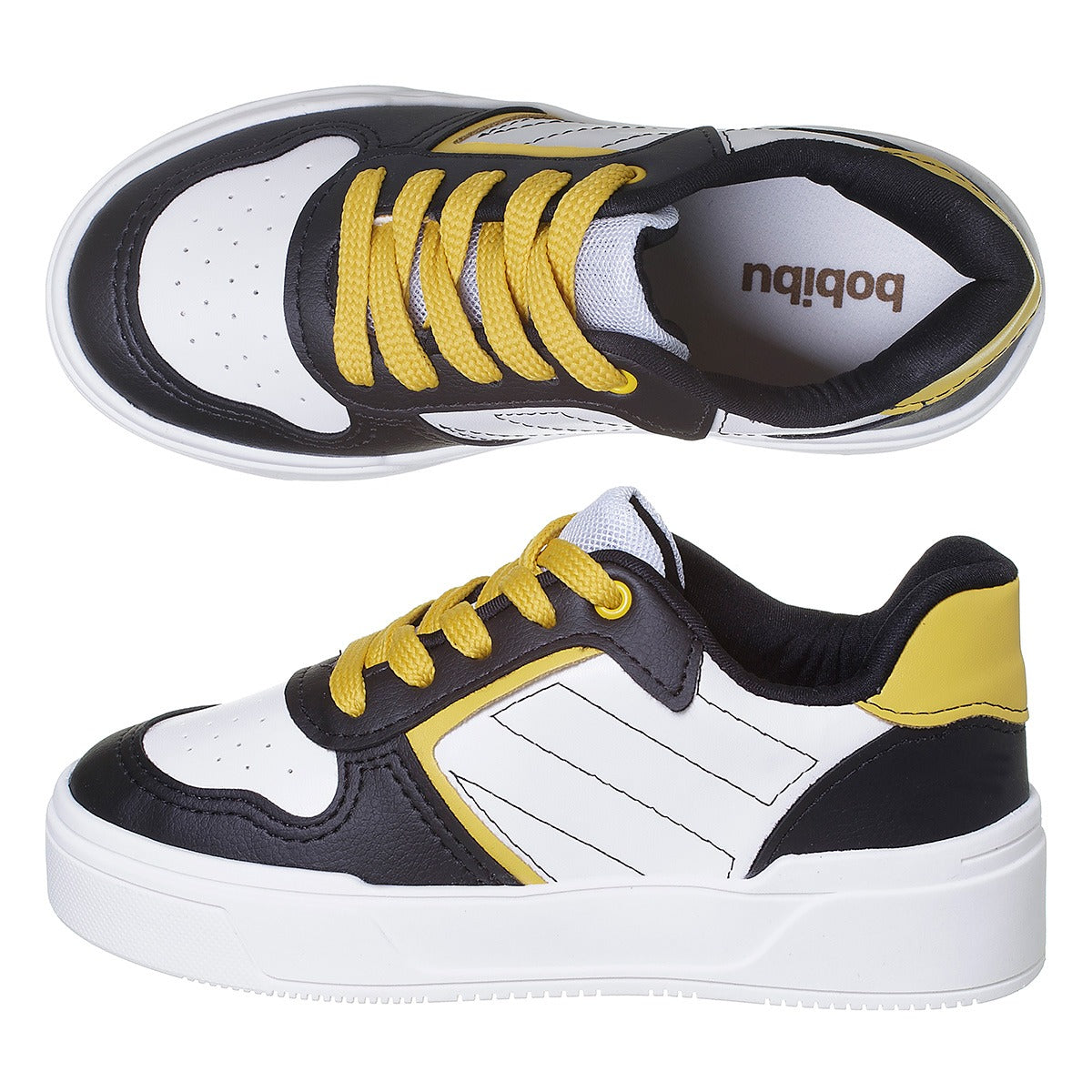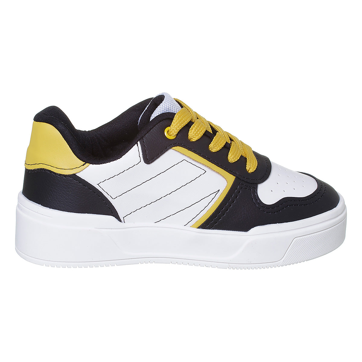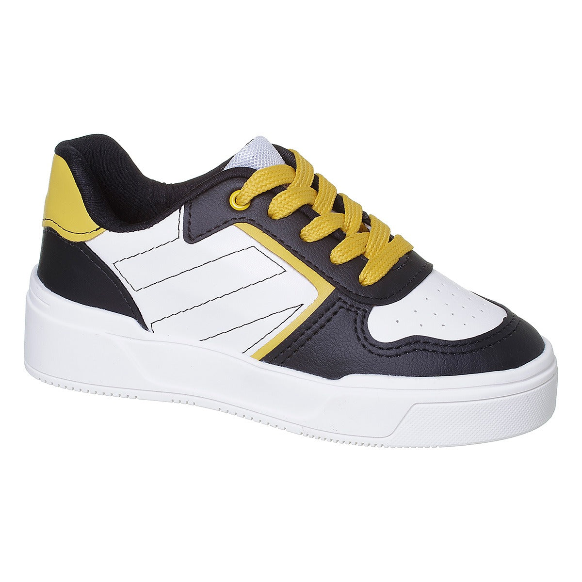 Com design moderno, o cabedal mistura as cores preto e branco com detalhes em amarelo vibrante, resultando em um visual descolado e cheio de personalidade. O fechamento em cadarço proporciona um ajuste firme e seguro, mantendo o pé confortável durante todo o uso.